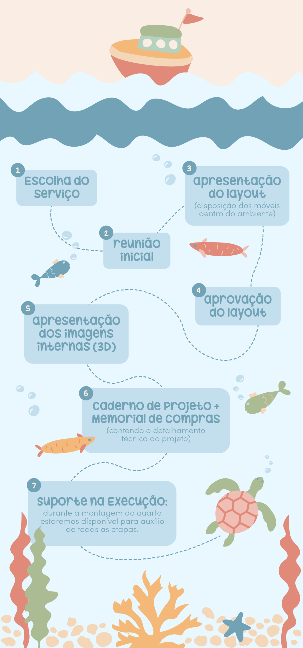 Seguir todas as etapas do projeto do quarto da sua criança é crucial para garantir que atendemos plenamente às suas necessidades. O processo, desde a concepção até a execução, permite uma compreensão profunda do que as crianças e suas famílias precisam. Aqui embaixo colocamos um esquema dessas etapas para um melhor entendimento: